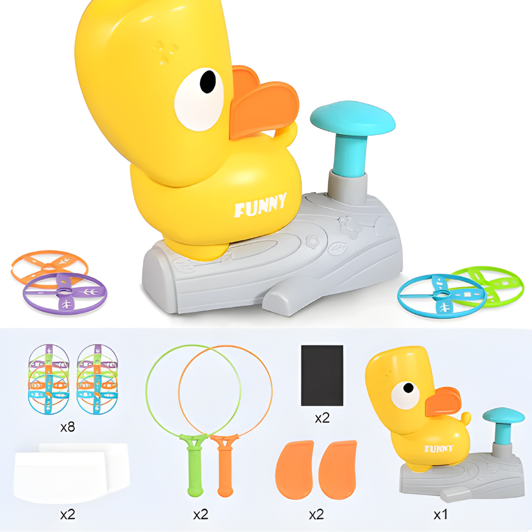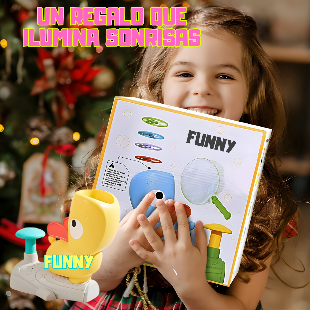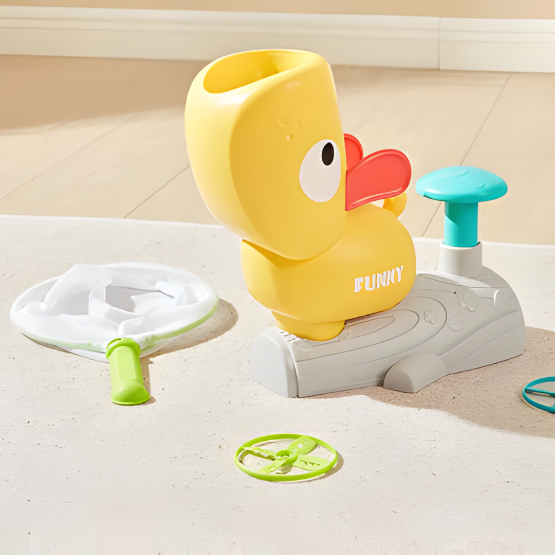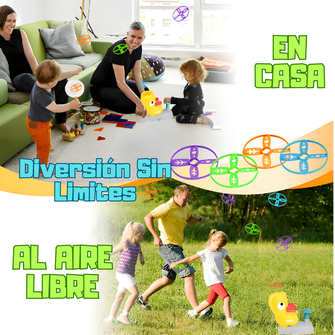 Funny dispara discos ligeros y seguros con un solo botón. Son suaves, vuelan alto y crean una competencia súper divertida